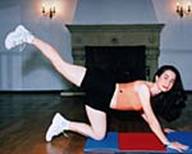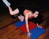 In genunchi, sprijinita in palme, se ridica piciorul drept lateral. Genunchiul ridicat trebuie sa fie paralel cu piciorul aflat la sol. Foarte bun pentru coapse. |