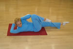 Se sta culcat intr-o parte, iar piciorul de deasupra se aduce in fata, atingandu-se cu genunchiul podeaua, de cate 20 de ori. Celalalt picior se tine indoit la spate si lipit de podea. |