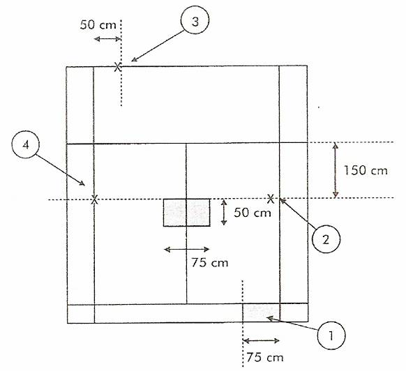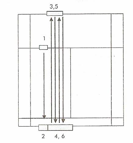 Fig.27.2. Schita jumatatii de teren de badminton pentru stabilirea ,,capacitatii anaerobe".Numele indica ordinea miscarii.