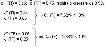 Rezulta din cele calculate ca Cv (TI) > Cv (TF) <10%, deci grupa de experiment este omogena. La grupa martor am putut determina omogenizarea buna a colectivului, calculand urmatorii parametri statistici: