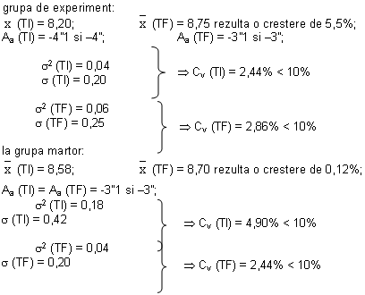 media aritmetica a rezultatelor la grupa de experiment a fost de 8,5 la testarea initiala, iar la cea finala de 8,87, ceea ce reprezinta o crestere de 0,37 care exprimata in procente este de 3,7%; dispersia si abaterea standard, ce stau la baza calcularii coeficientului de variabilitate au avut urmatoarele valori: