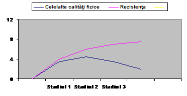 Din figura anterioara, observam ca viteza, ca si forta si indemanarea in cele 3 stadii de pregatire ale atletului, se afla fata de rezistenta pe o curba ascendenta in stadiul 1, apoi creste si atinge varful de dezvoltare spre sfarsitul stadiului 2, iar in stadiul 3, de pregatire, in timp ce rezistenta se dezvolta, viteza intra in perioada de regres.
