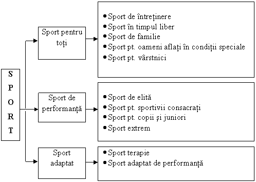 In „Manifestul despre sport' Consiliul International pentru Educatie Fizica si Sport de pe langa UNESCO face diferentieri intre sportul de performanta, sportul scolar si sportul in timpul liber. In aceasta tripla ipostaza a sportului, elevul poate practica toate formele: in scoala in cadrul lectiilor de educatie fizica si sportiva (cerc sportiv), sub indrumarea pedagogului; in lectia de antrenament sub indrumarea antrenorului in vederea obtinerii performantelor si in timpul liber, in mod independent sau asistat de un mentor.
