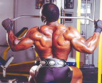 exercitiu este tractiuni cu priza larga la scripete (cu tractiuni la piept),