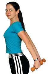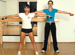 exercitiu: tinand bratele ridicate, coboara-le spre solduri. Repeta de opt ori.
