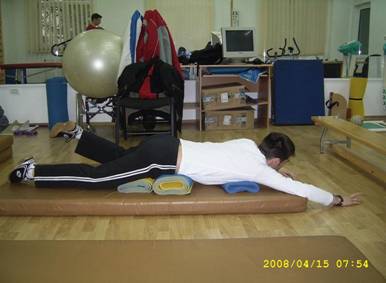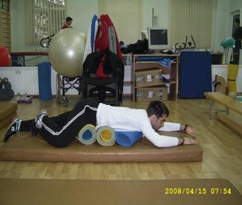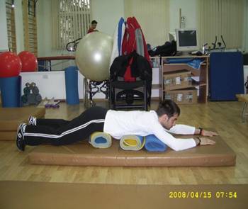 Descriere:- pe saltea cu rulouri sub abdomen, târâre înainte, mâna stânga în fata, dreapta în spate si invers, târâre, revenire.