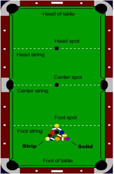 Bilele sunt asezate într-un triunghi cu bila 8 în mijloc, si bilele asezate alternativ, pline cu jumatati, în orice ordine, cu conditia ca la baza triunghiului într-unul din colturi sa se afle o plina si în celalalt o jumatate.