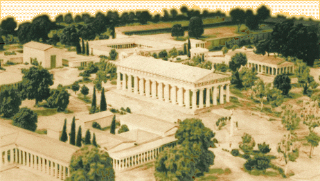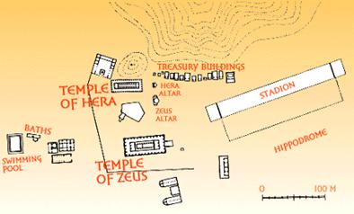 Model al Sanctuarului lui Zeus de la Olympia, unde primele jocuri tinute erau parte a festivalului religios īn cinstea lui Zeus. Templul lui Zeus era chiar īn centru. Grecii veneau la Sanctuarul lui Zeus de la Olympia mpartasind aceleasi credinte religioase si vorbind aceeasi limba. Atletii erau toti cetateni barbati ai oraselor-state din toate colturile lumii grecesti, īncepānd cu īndepartata Iberia (Spania) din vest si pāna la Marea Neagra (Turcia) īn est. Sanctuarul a fost numit īn antichitate dupa muntele Olympos, cel mai īnalt munte din Grecia continentala. Īn mitologia greaca, muntele Olympos era casa celor mai mari zei si zeite grecesti. |