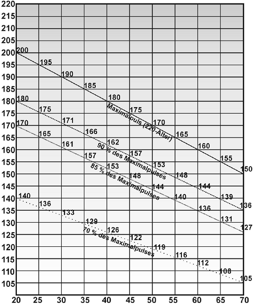 În primele saptamâni pulsul ar trebui sa fie în timpul antrenamentului în limita inferioara de 70% din pulsul maxim. În urmatoarele saptamâni si luni frecventa pulsului poate sa creasca încet pâna la valoarea superioara de 85% din pulsul maxim. Cu cât creste conditia fizica a persoanei care se antreneaza, cu atât trebuie sa creasca si intensitatea antrenamentului. Acest lucru este posibil prin prelungirea duratei de antrenament si /sau prin ridicarea nivelului de dificultate.