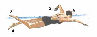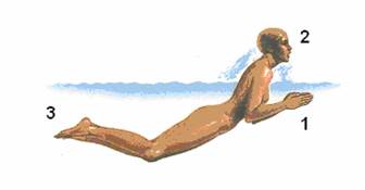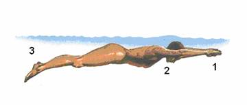 1.   232b16c ;   232b16c ; capul situat intre brate cu fruntea putin ridicata; 2.   232b16c ;   232b16c ; bratele sunt intinse inainte, favorizand miscarea de alunecare pe apa; 3.   232b16c ;   232b16c ; picioarele sunt intinse si apropiate. |
