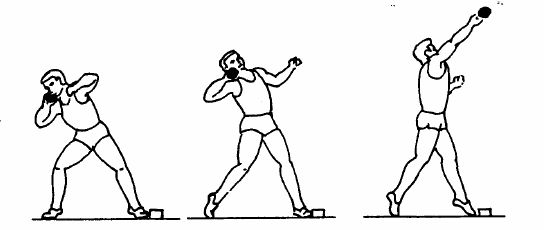 Greutatea ramane lipita de gat, pana cand atletul 'simte' trecerea corpului pe piciorul stang, urmeaza ridicarea umarului drept si apoi intinderea foarte energica a bratului aruncator.