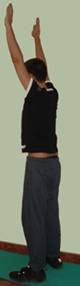 intins paralel cu corpul. Bratul drept, cat mai sus, spre spate, sariti pe loc,